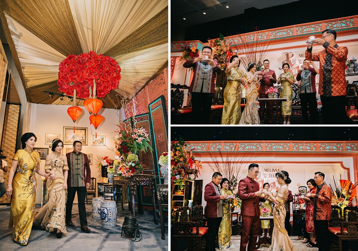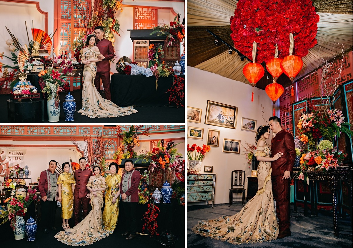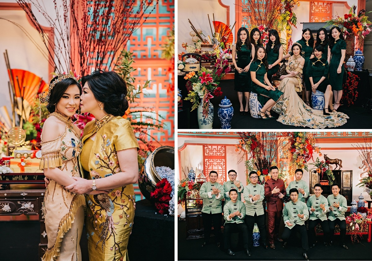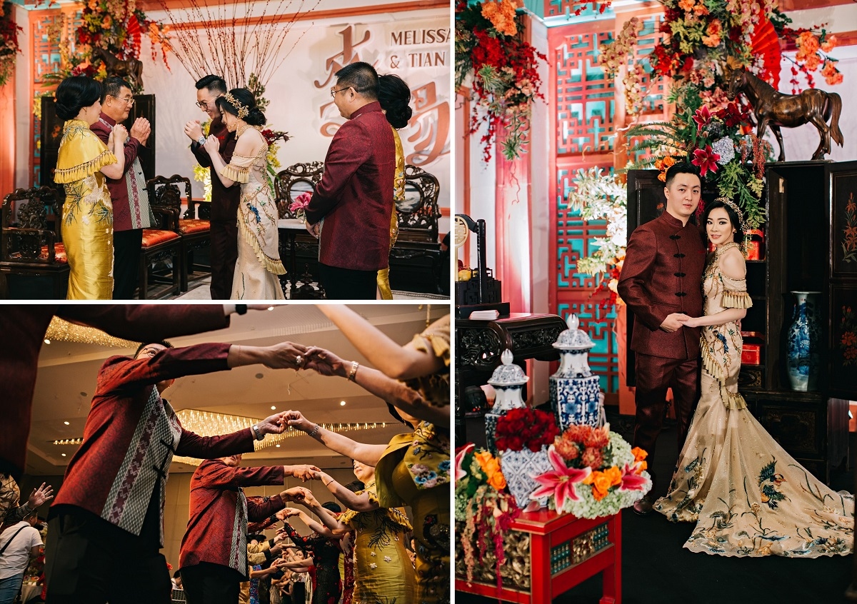 We also made the décor very personal, with old family photos, some furniture directly from our home, and we avoided using stage (even though it was a ballroom) to ensure a warm and homey feeling as two families came together. I also designed the monogram myself, combining two Chinese characters of our surnames and the letters T & M, all stationeries (menu card, souvenir packaging, invitations), and the qipaos worn by our friends who helped carry each tray of wedding gifts.