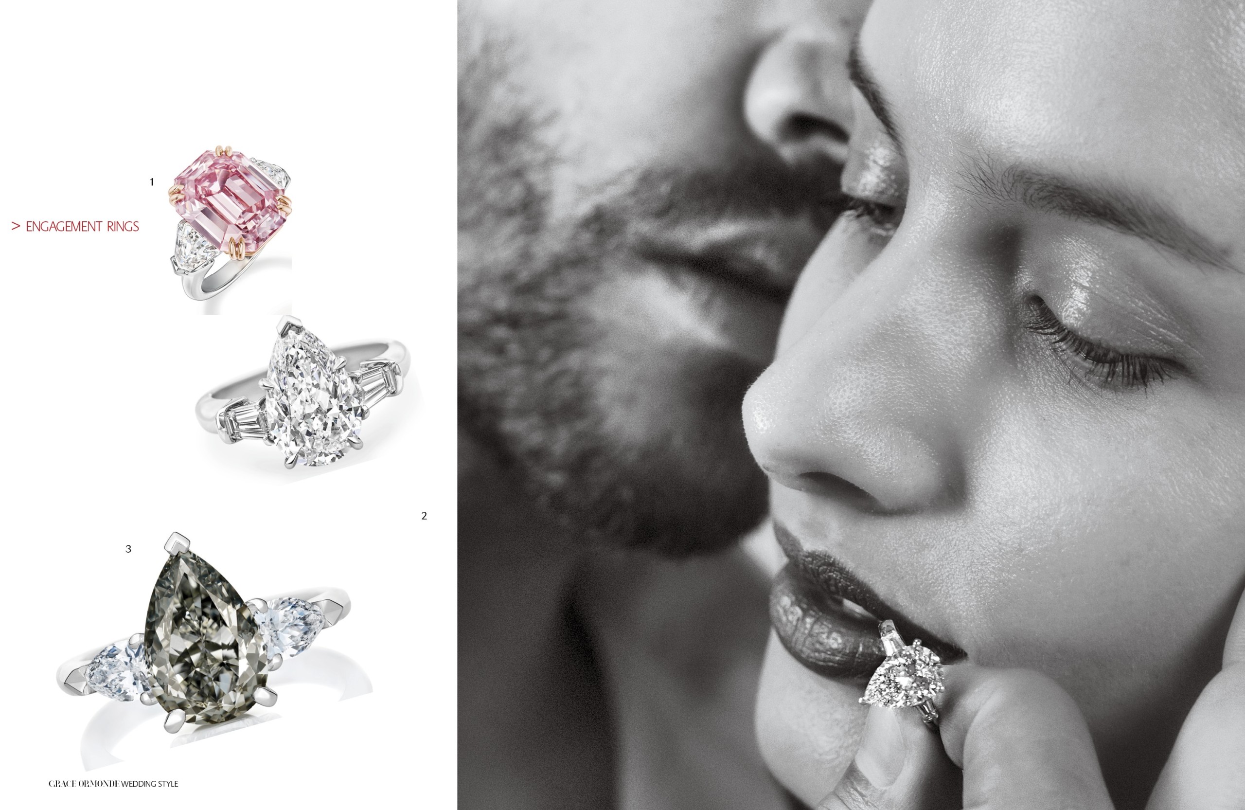 1. Harry Winston Pink Emerald-Cut Engagement Ring. 2. Harry Winston Pear-Shaped Ring with Tapered Baguette Side Stones. 3. De Beers