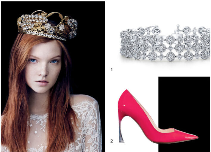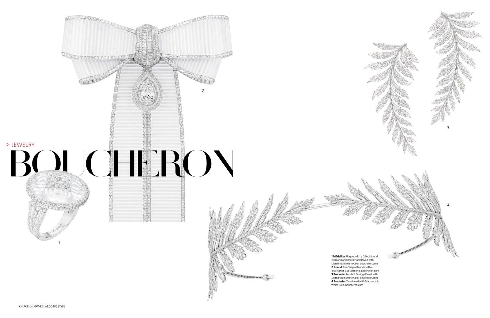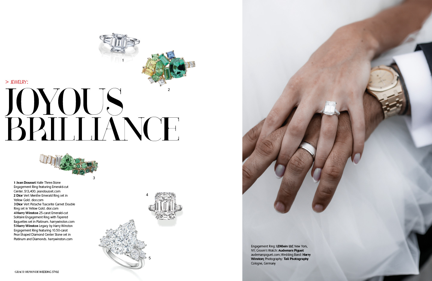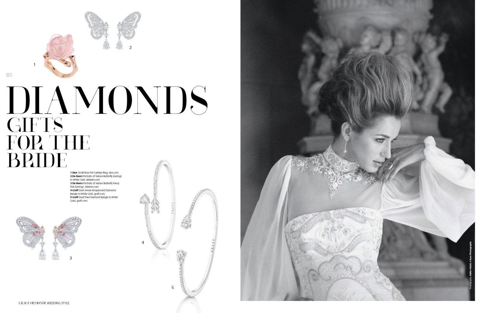 1 Dior Small Rose Pré Catelan Ring. 2 De Beers Portraits of Nature Butterfly Earrings in White Gold. 3 De Beers Portraits of Nature Butterfly Fancy Pink Earrings. 4 Graff Duet Arrow Wraparound Diamond Bangle in White Gold. 5 Graff Duet Pavé Diamond Bangle in White Gold.The bride and groom gift exchange is a tradition