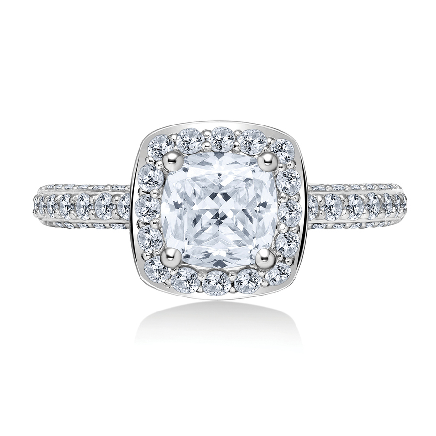 Each “Kollection” features unique design details that may be translated many different ways to reflect the couple choosing the ring. The Pyramid Kollection focuses on the pointed stud motif reminiscent of the iconic symbol he has used in many edgy accessory designs. This reoccurring design leads up the ring shank enhancing the center diamond.