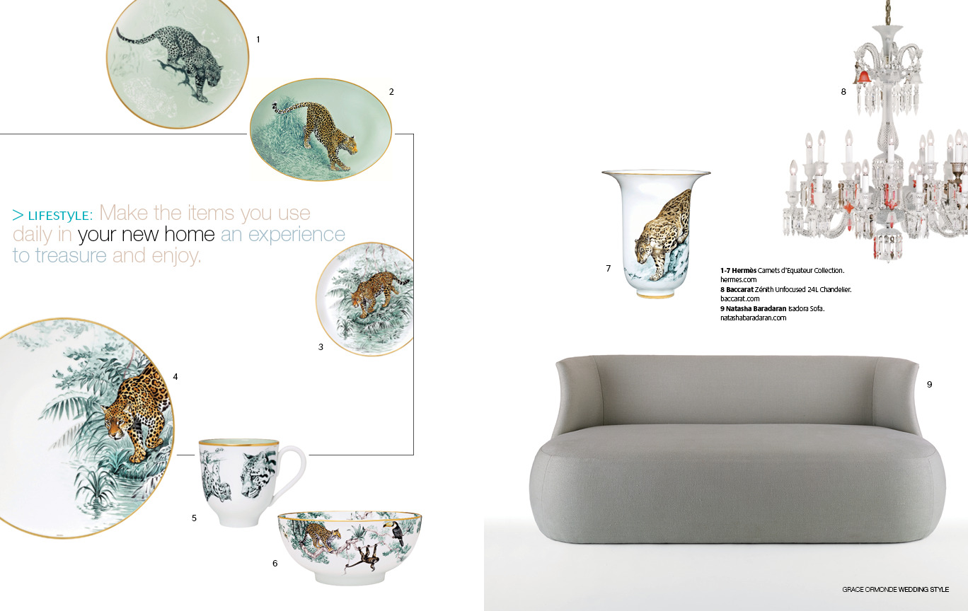1. – 7. Hermès Carnets d’Equateur Collection; 8. Baccarat Zénith Unfocused 24L Chandelier; 9. Natasha Baradaran Isadora Sofa1. Wedgwood Tea Garden Collection 3-Piece Set; 2. Caskata Artisanal Home Hawthorne Gilt Berry Bowl; 3. Richard Ginori Cucù Baby Plate; 4. Lalique 2017 Aphrodite Vintage Decanter; 5. Hebanon® By Fratelli Basile Geometry Collection Cube Sideboard; 6. Giardini di