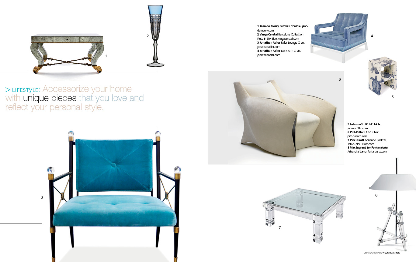 1. Jean de Merry Borghesi Console; 2. Varga Crystal Barcelona Collection Flute in Sky Blue; 3. Jonathan Adler Rider Lounge Chair; 4. Jonathan Adler Doris Arm Chair; 5. Johnson3 LLC JMF Table; 6. Pitt-Pollaro CC-1 Chair; 7. Plexi-Craft Adrienne Cocktail Table; 8. Max Ingrand for FontanaArte Ashanghai Lamp1. GABRIEL SCOTT Marx Stool; 2. Pitt-Pollaro Cocktail