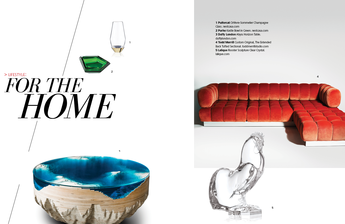 1. Puiforcat Orfévre-Sommelier Champagne Glass; 2. Purho Kastle Bowl in Green; 3. Duffy London Abyss Horizon Table; 4. Todd Merrill Custom Original, The Extended Back Tufted Sectional; 5. Lalique Rooster Sculpture Clear Crystal1. Mario Marenco Marenco Sofa for Arflex; 2. Lee Broom On the Rock Martini Glass; 3. Markus Haase Ash and Marble Aeolian Table;
