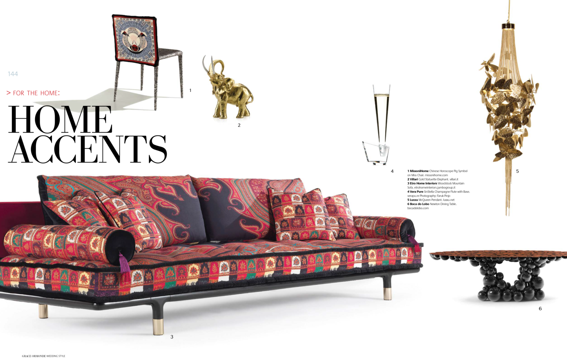 1. MissoniHome Chinese Horoscope Pig Symbol on Miss Chair; 2. Villari Gold Statuette Elephant; 3. Etro Home Interiors Woodstock Mountain Sofa; 4. Vera Pure SinStella Champagne Flute with Base, Photography: Faruk Pinjo; 5. Luxxu McQueen Pendant; 6. Boca do Lobo Newton Dining Table1. Boca do Lobo Feel Table Lamp in Lapis Blue; 2. Villari Porcelain
