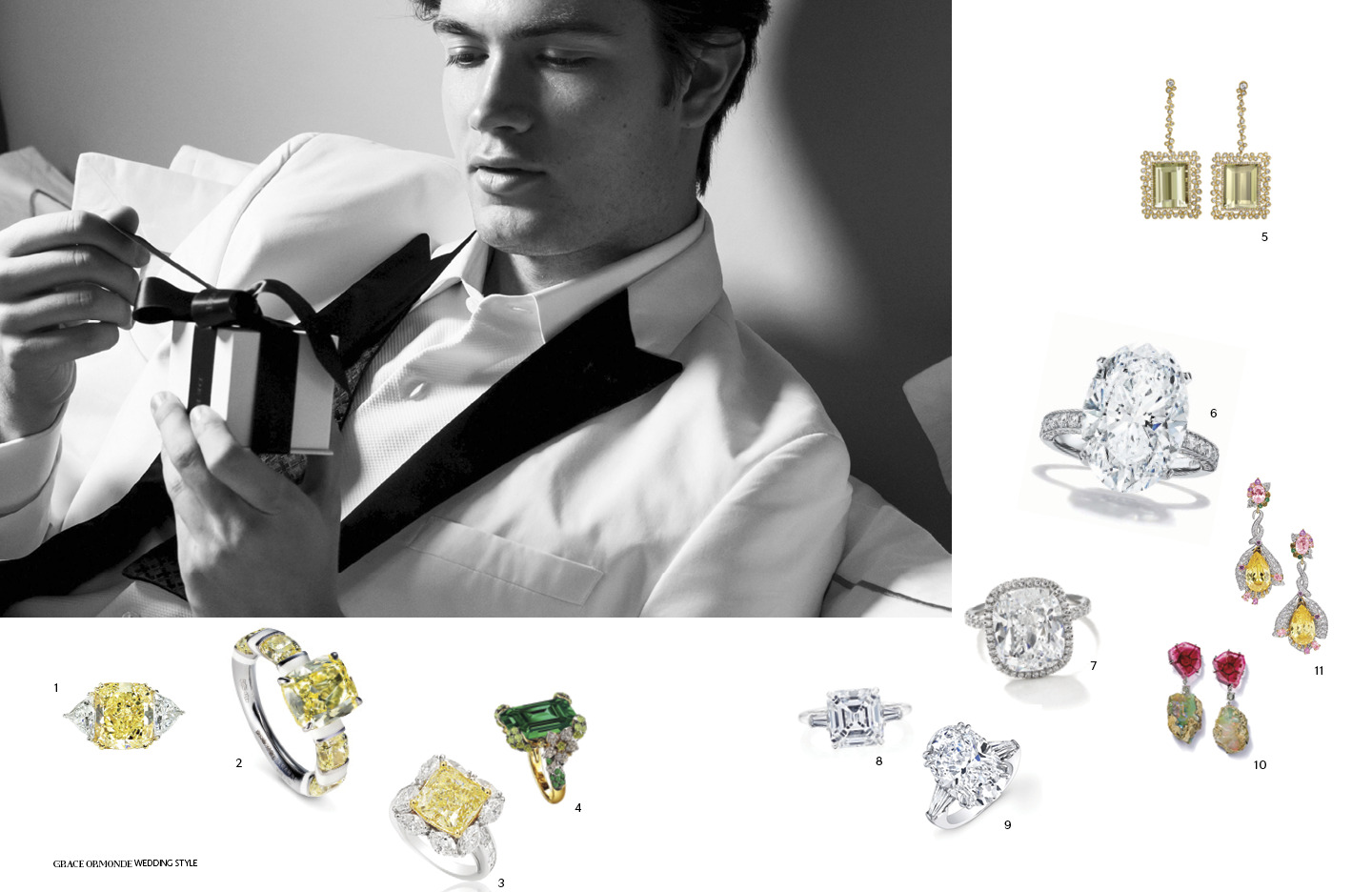 Ring Box: De Beers; Location: The Plaza Hotel, New York, NY; Fashion Stylist: Jules Wood for L&A Artist/L Group Productions, Milan, Italy; Photography: Kellie Walsh, 4 Eyes Photography, New York, NY; 1. Forevermark by Premier Gem 10.90 ct. Exceptional Fancy Yellow Cushion-cut Diamond Ring set in Platinum; 2. Sarah Ho London Candy Enamel Yellow Diamond Ring; 3. Picchiotti 7 ct. Fancy Yellow Natural Color Cushion-cut Diamond surrounded by Marquise Diamonds; 4. Anabela Chan 18 ct. Emerald-cut Cinderella Ring; 5. VTse 18K Yellow Gold and Green Beryl Earrings with 3.20 ct. Diamonds; 6. Tiffany & Co. Oval-cut Diamond Ring set in Platinum with Round Diamonds; 7. Forevermark by Premier Gem 7.04 ct. Exceptional Cushion-cut Diamond Ring set in Platinum; 8. Stephen Silver Fine Jewelry GIA-certified 5 ct. Asscher-cut Diamond Engagement Ring; 9. Norman Silverman Diamonds 12.5 ct, Oval-cut Diamond Engagement Ring; 10. Jan Leslie Bold and Super-Light Tribal Luxury Statement Earrings; 11. Anabela Chan Fuchsia Canary Earrings