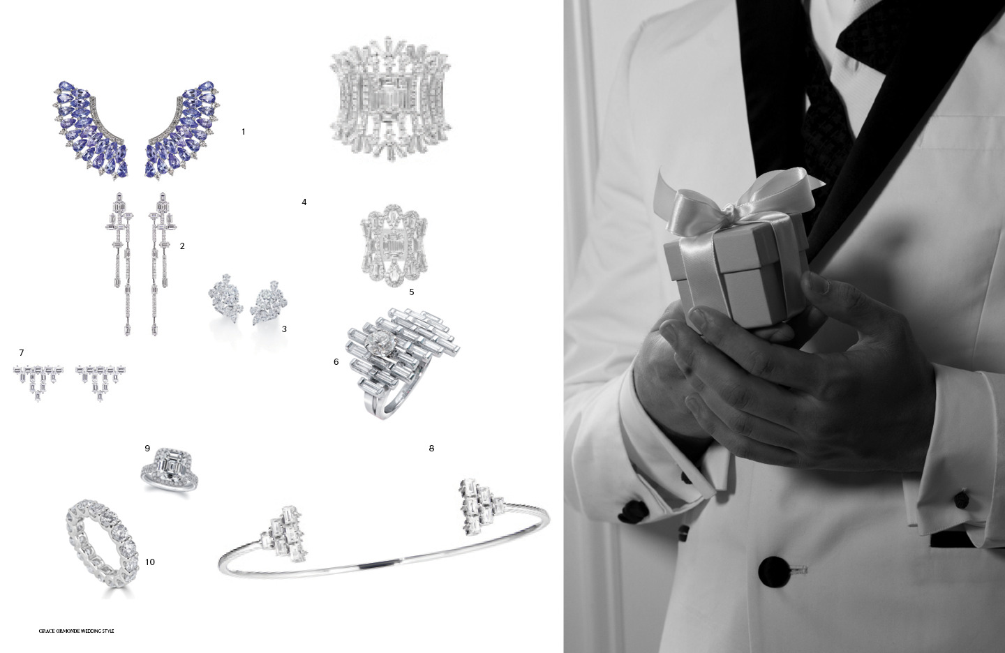 1. Hueb Mirage Earrings featuring Diamonds and Blue Sapphires; 2. AS29 Baguette Collection Diamond Dangling Earrings; 3. Forevermark Frozen Beauty Diamond Earrings; 4. and 5. Djula Gold and Diamonds Beverly Hills Rings; 6. Mathon Paris One-of-a-Kind Brooklyn Diamond Ring featuring 23 Diamond Baguettes; 7. AS29 Baguette Triangle Diamond Earrings; 8. AS29 Triangle Diamond Cuff; 9. Norman Silverman Diamonds 5 ct, Asscher-cut Diamond Ring with Pave; 10. Cirari Eternity Wedding Band featuring 5.63 ct, Round Diamonds; Ring Box: Tiffany & Co.; Location: The Plaza Hotel, New York, NY; Fashion Stylist: Jules Wood for L&A Artist/L Group Productions, Milan, Italy; Photography: Kellie Walsh, 4 Eyes Photography, New York, NY