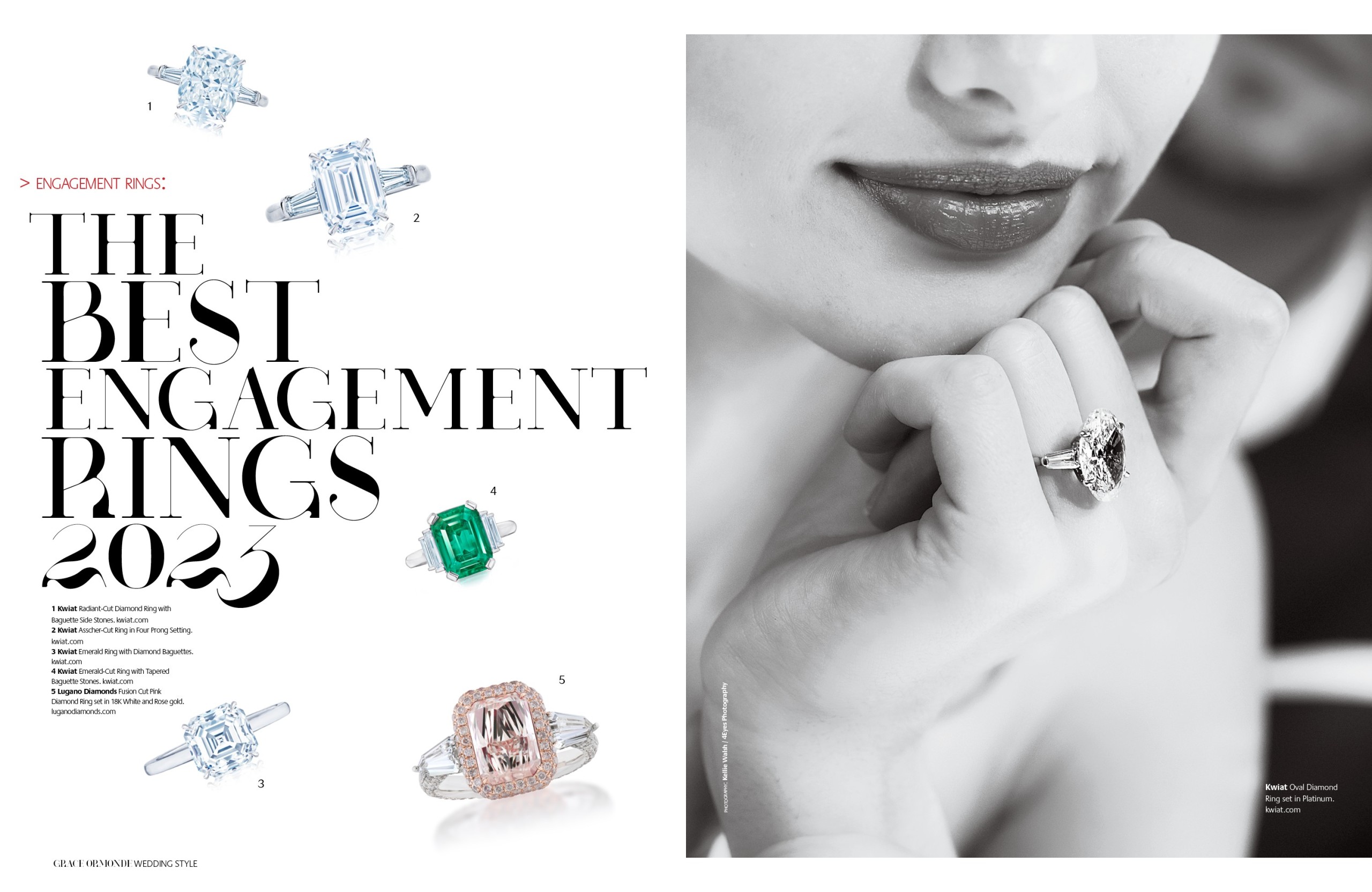 1 Kwiat Radiant-Cut Diamond Ring with Baguette Side Stones. 2. Kwiat Asscher-Cut Ring in Four Prong Setting. 3. Kwiat Emerald Ring with Diamond Baguettes. 4. Kwiat Emerald-Cut Ring with Tapered Baguettes Stones. 5. Lugano Diamond Fusion Cut Pink Diamond Ring set in 18K White and Rose gold.