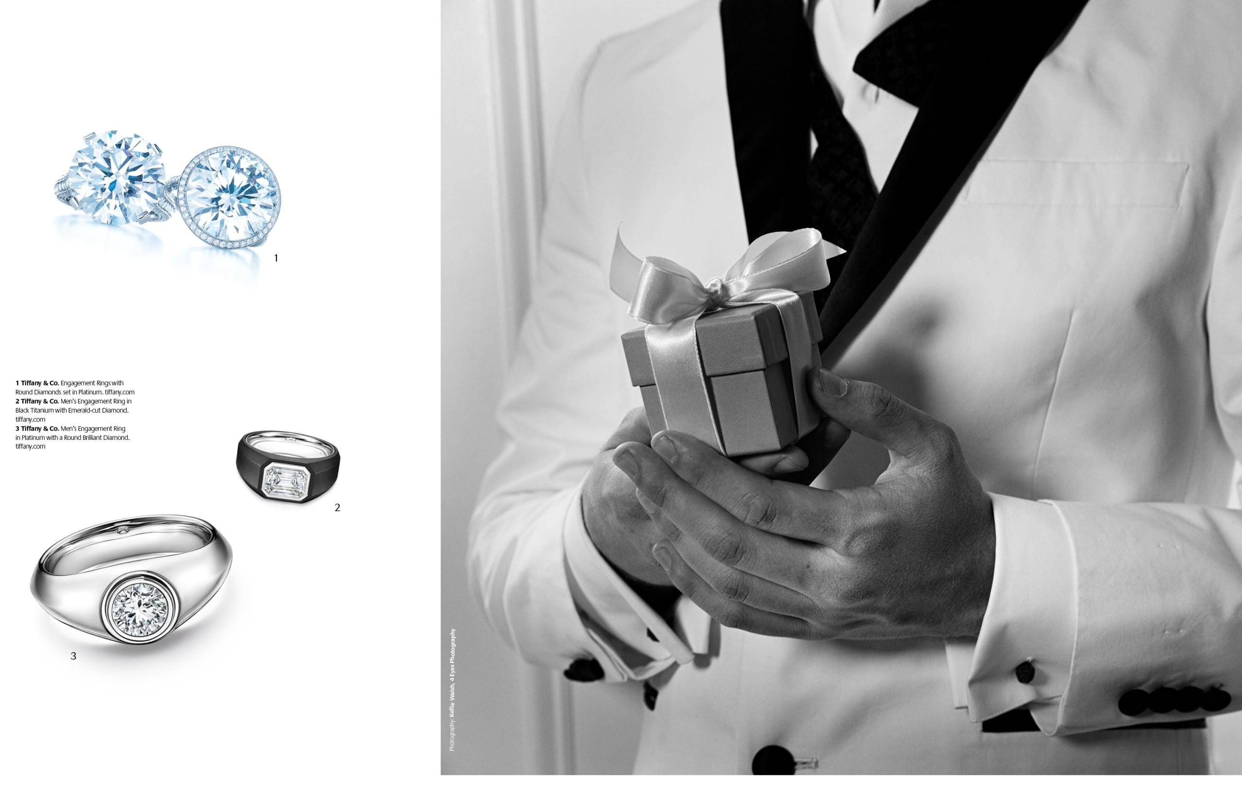 1 Tiffany & Co. Engagement Rings with Round Diamonds set in Platinum. 2 Tiffany & Co. Men’s Engagement Ring in Black Titanium with Emerald-cut Diamond. 3 Tiffany & Co. Men’s Engagement Ring in Platinum with a Round Brilliant Diamond.