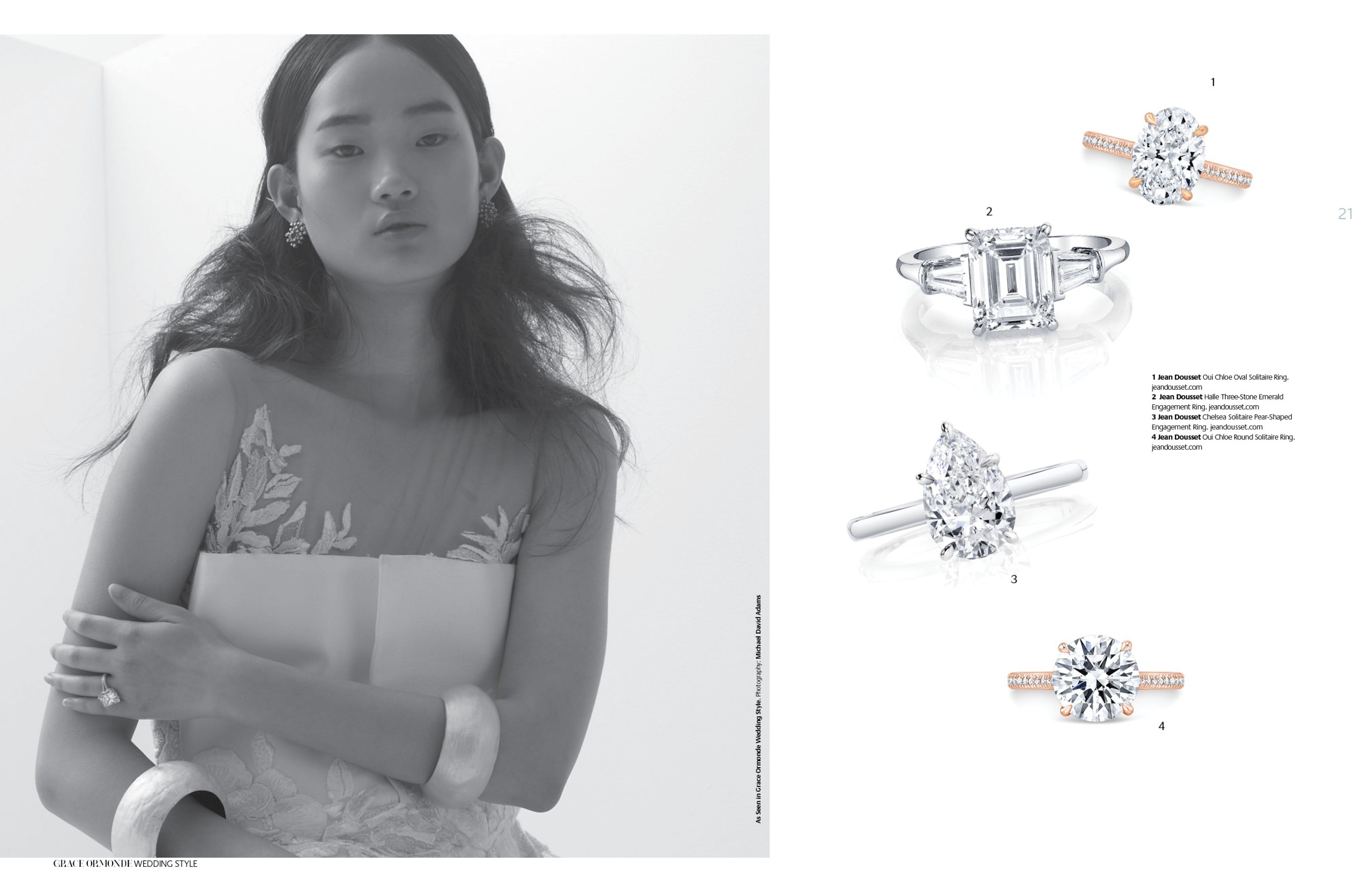 1 Jean Dousset Oui Chloe Oval Solitaire Ring. 2 Jean Dousset Halle Three-Stone Emerald Engagement Ring. 3 Jean Dousset Chelsea Solitaire Pear-Shaped Engagement Ring. 4 Jean Dousset Oui Chloe Round Solitaire Ring.