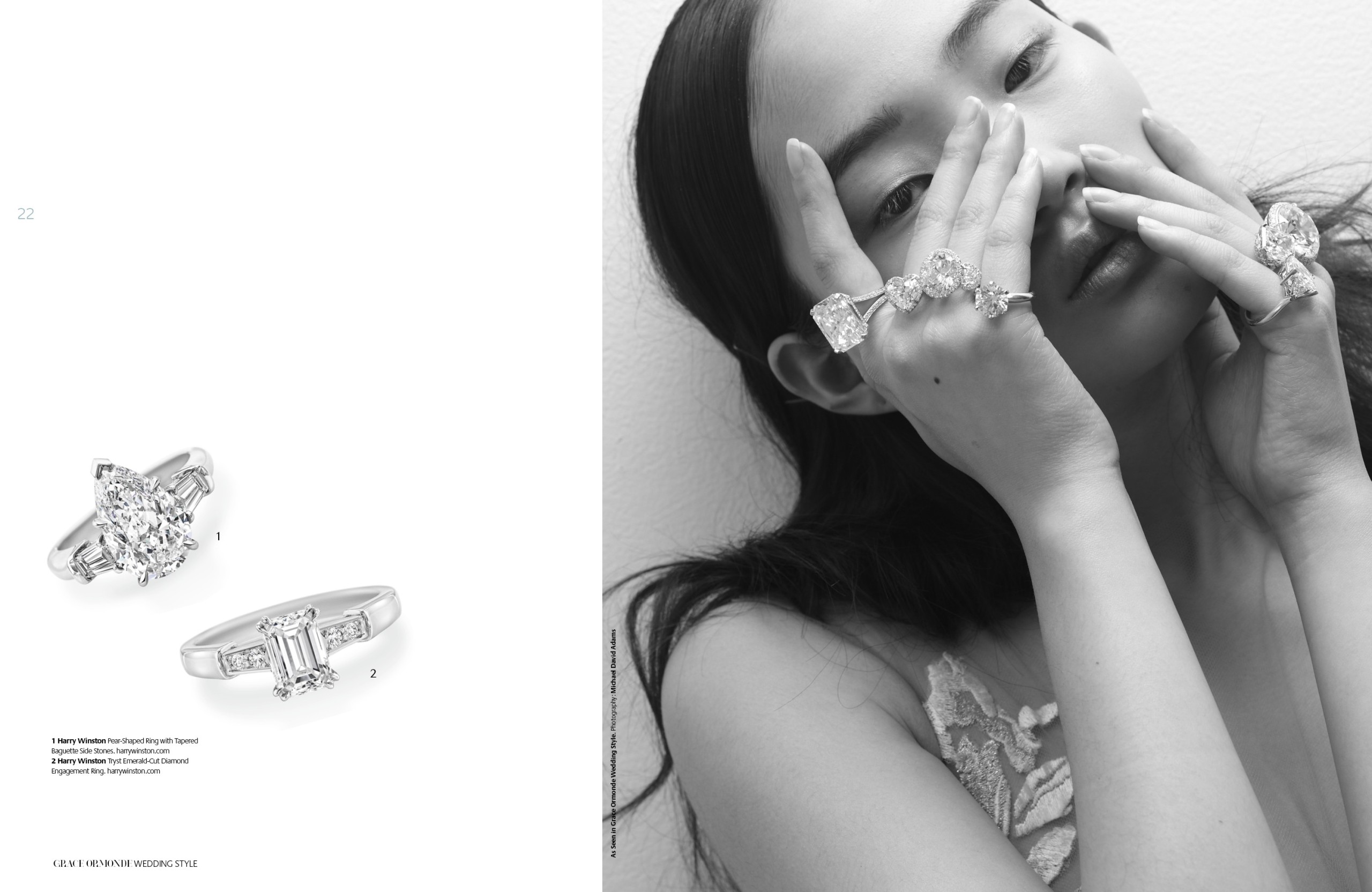 1 Harry Winston Pear-Shaped Ring with Tapered Baguette Side Stones. 2 Harry Winston Tryst Emerald-Cut Diamond Engagement Ring.