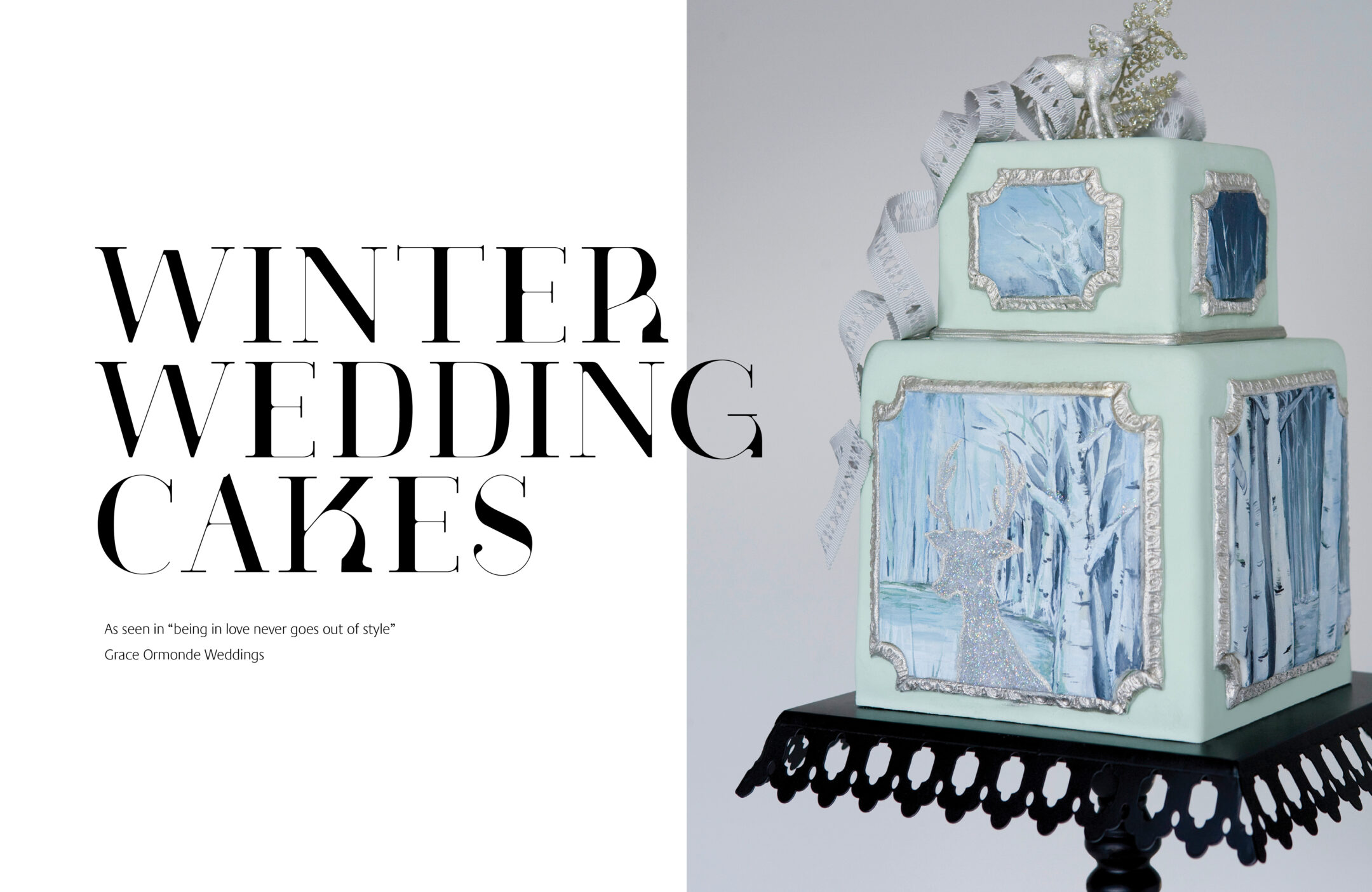 Forest themed cake with ribbon, crystals and handprinted winter landscape with glittering deer topper. Cake: Cake Opera; Photography: Five15fifteen Photo CoWhy are winter weddings the best? That may be up for debate between warm and cold weather lovers; but as the industry’s top cake artists have proven, winter weddings set the stage for some truly